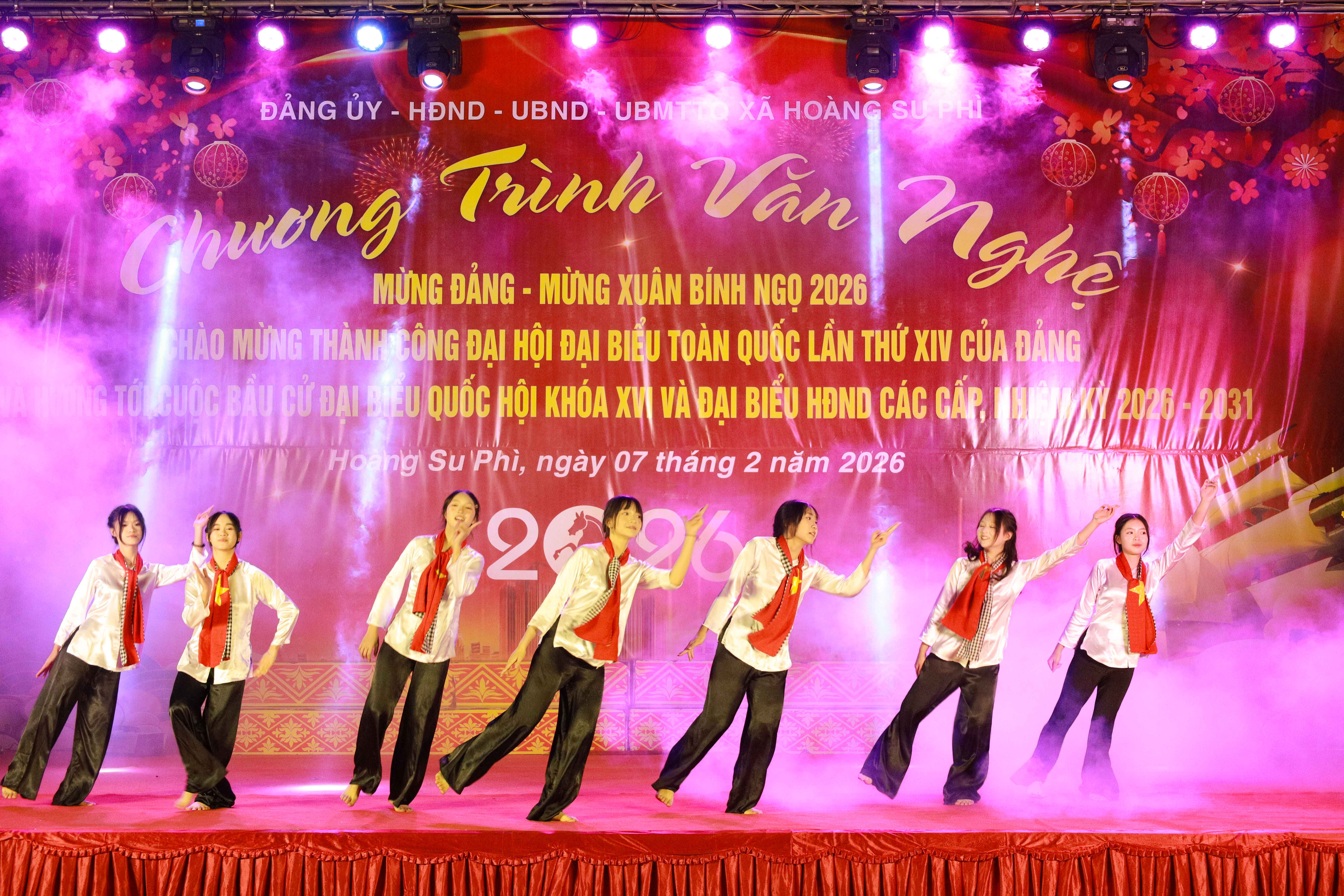 Trong không khí hân hoan, phấn khởi chào Xuân Bính Ngọ năm 2026; Chào mừng thành công Đại hội Đại biểu toàn quốc lần thứ XIV của Đảng và hưởng tới cuộc bầu cử Đại biểu Quốc hội khoá XVI và Đại biểu HĐND các cấp, nhiệm kỳ 2026 - 2031. Tối ngày 7/2, Đảng uỷ, HĐND, UBND, UBMTTQ xã Hoàng Su Phì long trọng tổ chức Chương trình văn nghệ mừng Đảng, mừng Xuân, mừng đất nước đổi mới với chủ đề “Xuân trên quê hương” do các nam nữ diễn viên đến từ Trung tâm Dịch vụ công, các cơ quan, đơn vị, trường học trên địa bàn xã Hoàng Su Phì thể hiện. Đến xem và cổ vũ có đồng chí Đàm Đức Phương - Ủy viên BTV Đảng ủy, Phó Chủ tịch UBND xã.